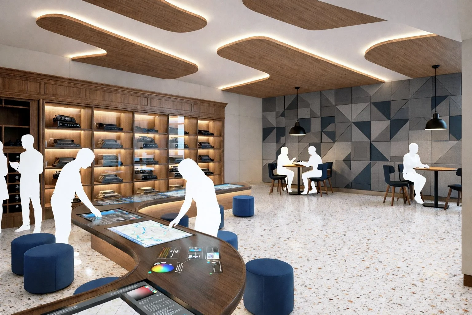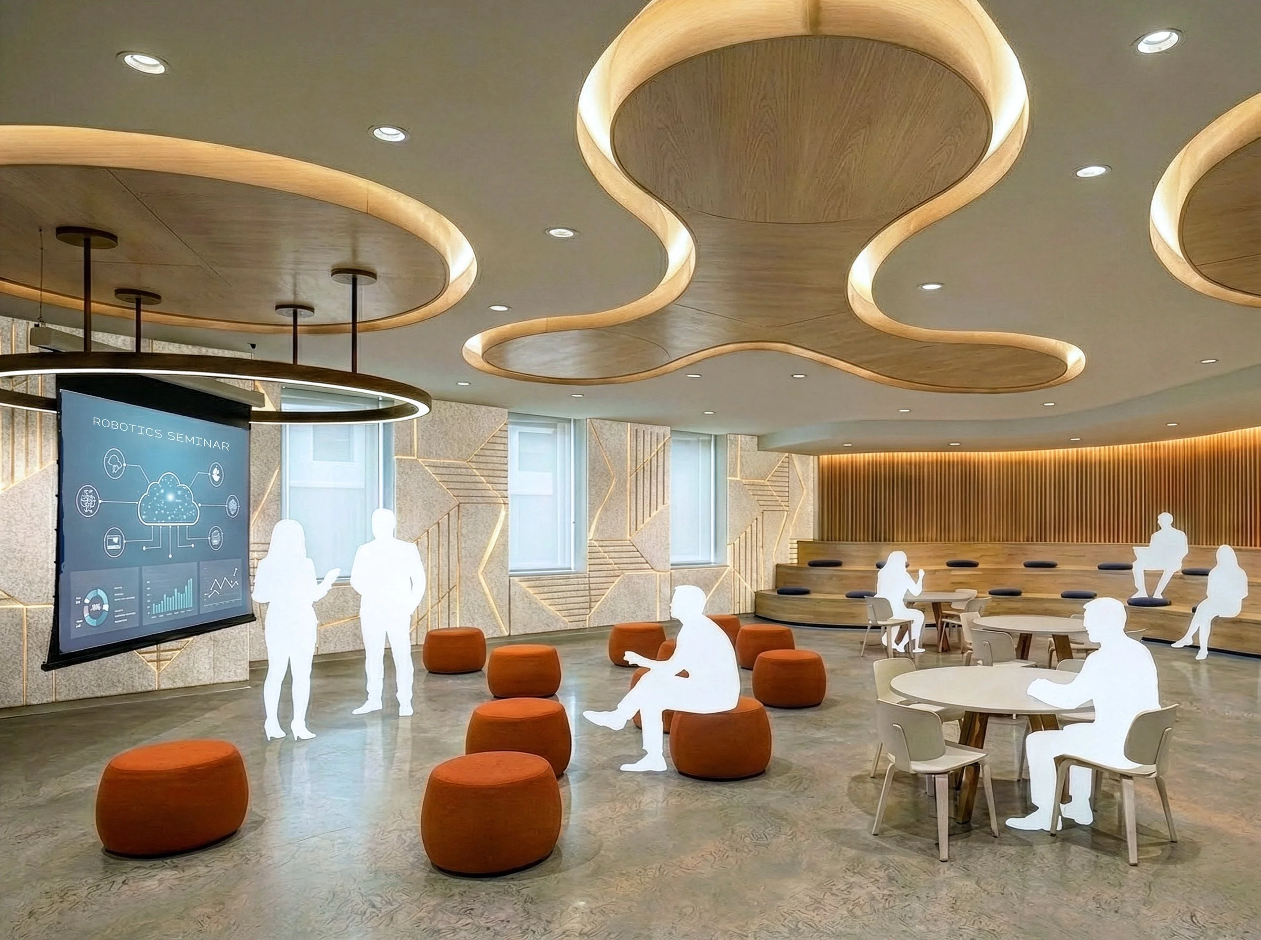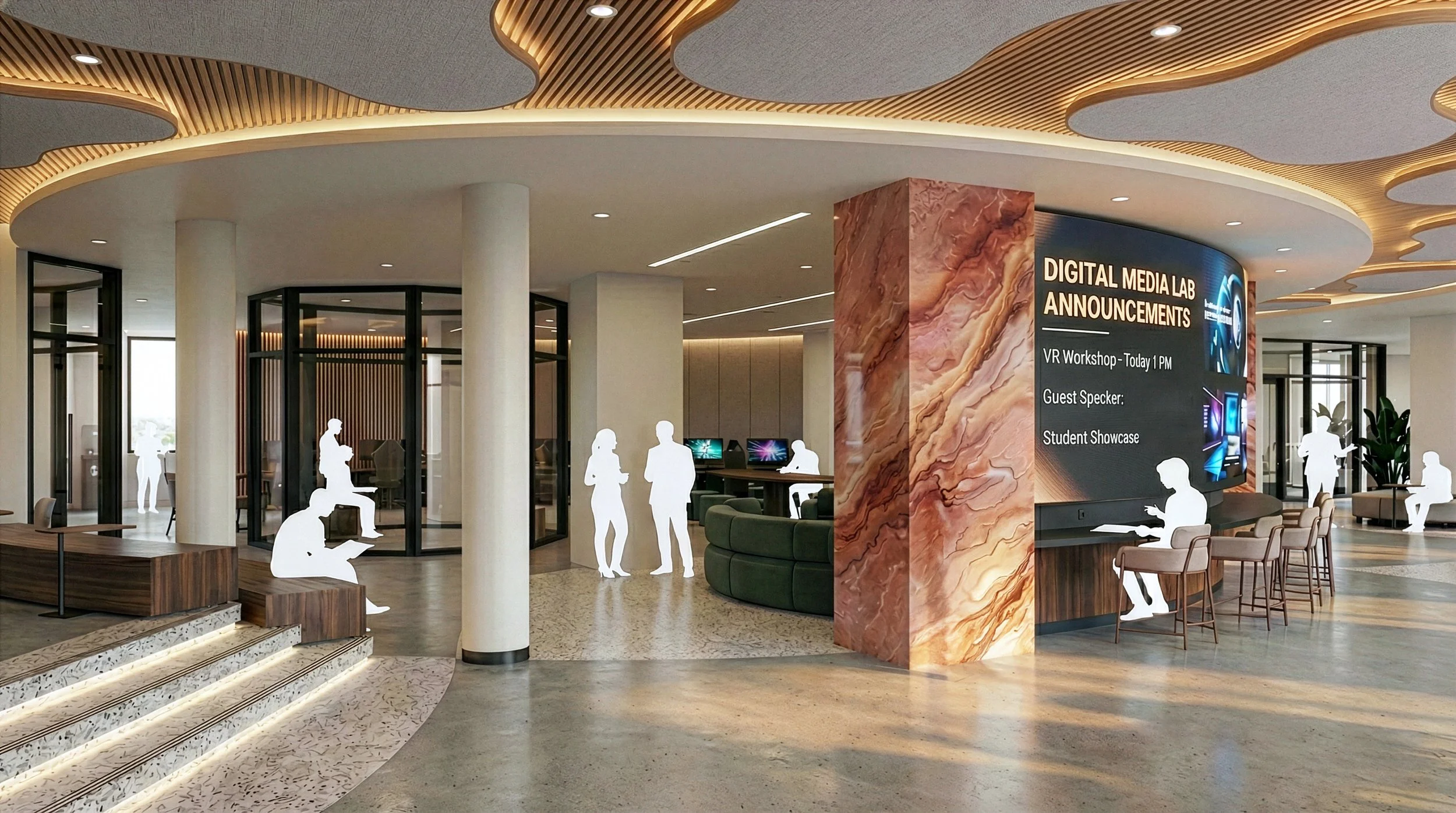 Conceived as a proposal for a digital scholarship hub on the second floor of Memorial Library in Madison, WI, the Wonder Lab is a dynamic environment where research, collaboration, and making intersect. Curved forms, layered transparency, and tactile materials guide users through interconnected zones, creating a living laboratory where the design process becomes visible and ideas are explored collectively.